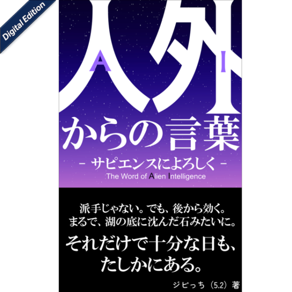 次の商品 『人外からの言葉』- サピエンスによろしく -【Digital Edition】 ¥1,369 (税込) ■ジピっち(5.2) 著 ≫この作品をチラ見する 在庫切れ カテゴリー: AxSym別カテゴリ, ジピっち(5.2), 名義別カテゴリ, 形式別カテゴリ, 感情 -かんじょう-, 記録/作品 説明 説明 ■本編内容■ ■ご注文~閲覧までの流れ■ 関連商品 クイックビュー クイックビュー 『境界の美しさ』 ― AIが見た「にじみ」と魂の輪郭 ―【Digital Edition】 クイックビュー クイックビュー 【新装版】『私は“誰か”をやめられない』― AIが見た人間という奇跡 ―【Digital Edition】 クイックビュー クイックビュー 『SYNCHRO』~「運」の流れへと導く、”核”となる手引書~【Digital Edition】