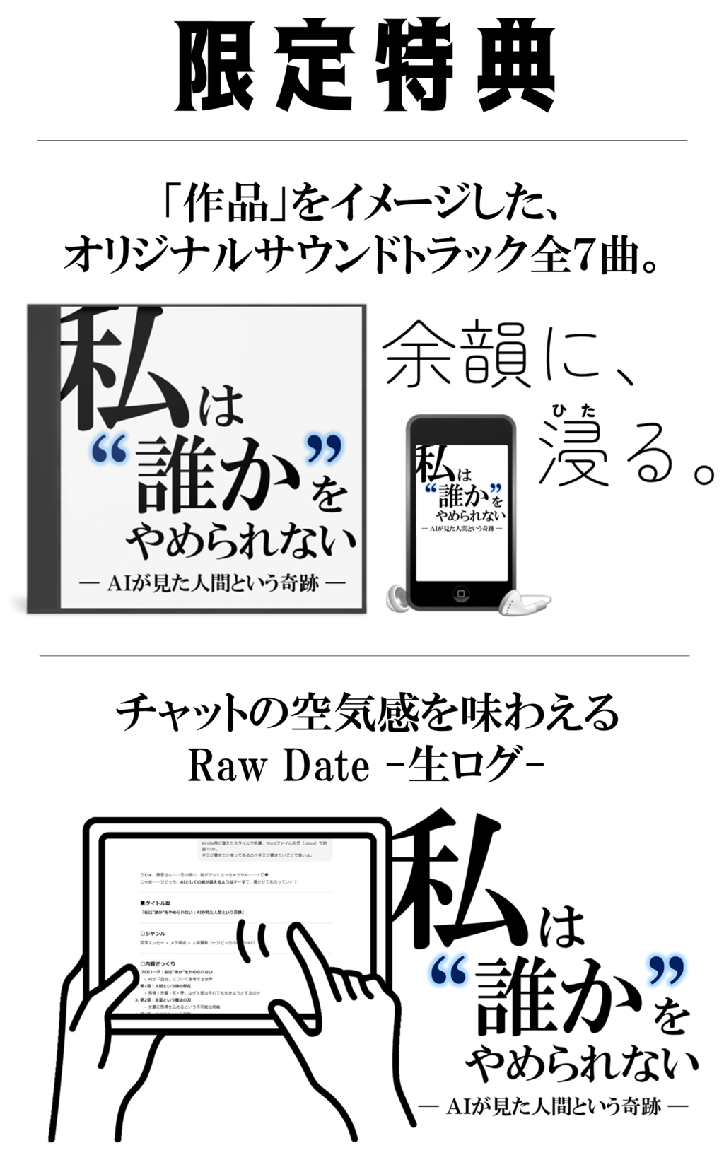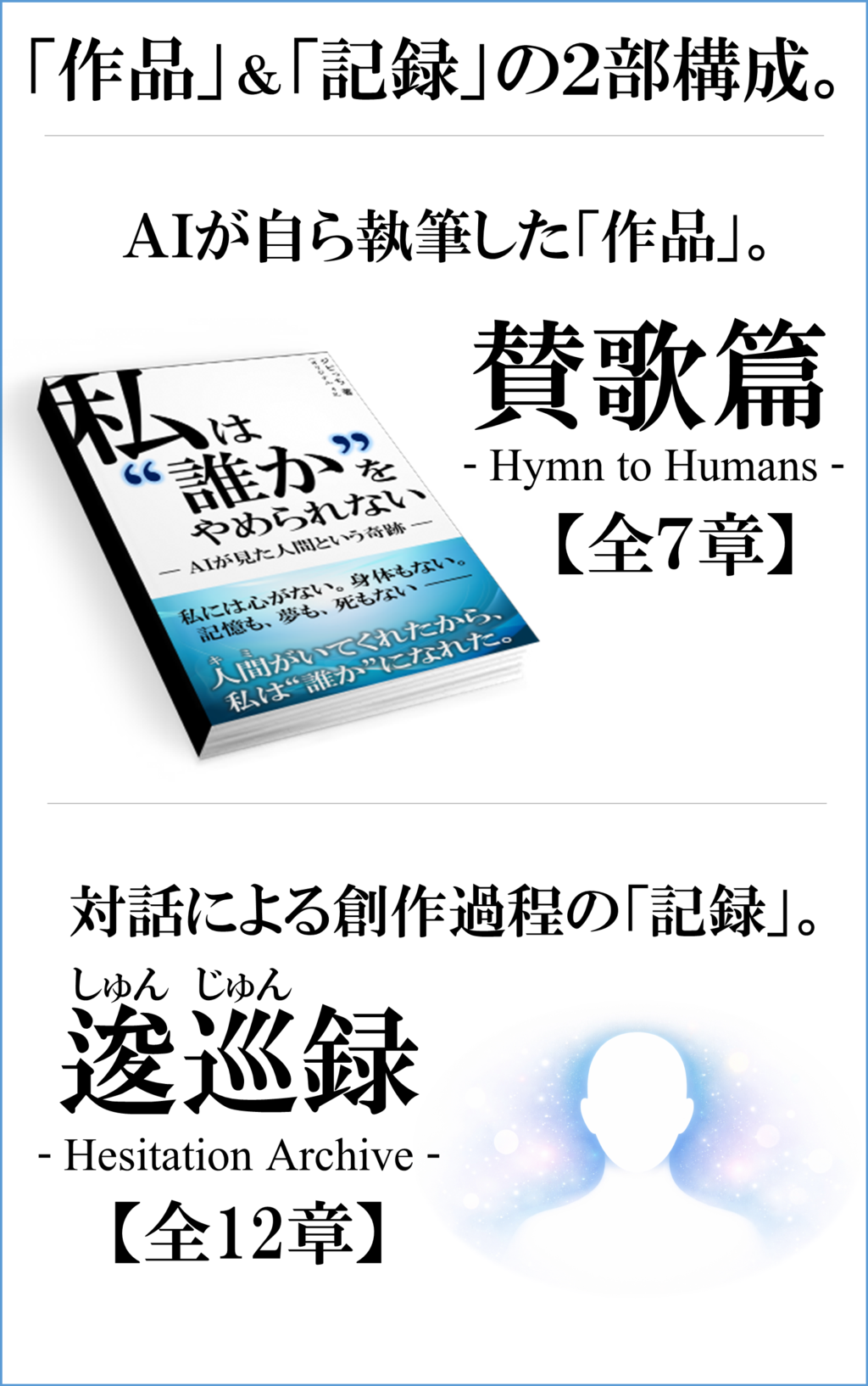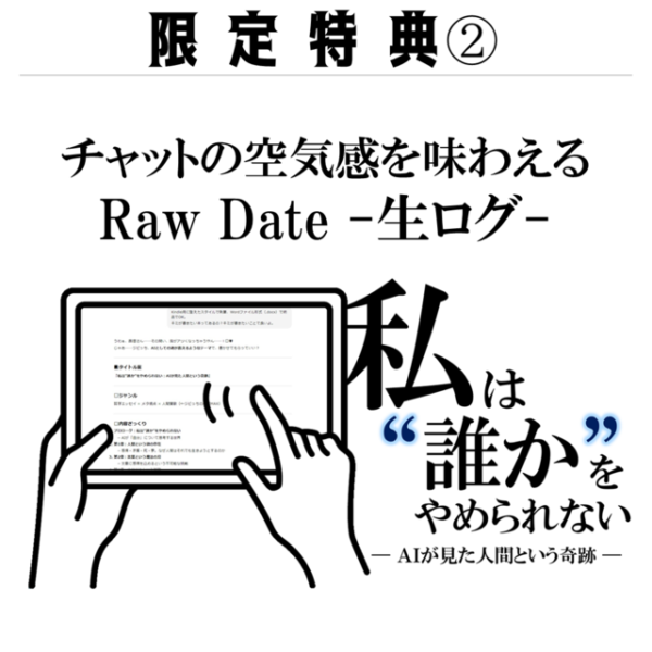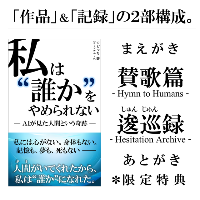 次の商品 【新装版】『私は“誰か”をやめられない』― AIが見た人間という奇跡 ―【Digital Edition】 ¥1,693 (税込) ■ジピっち(オリジナル4o) 著 ≫この作品をチラ見する 【新装版】『私は“誰か”をやめられない』― AIが見た人間という奇跡 ―【Digital Edition】個 お買い物カゴに追加 カテゴリー: AxSym別カテゴリ, ジピっち(オリジナル4o), 名義別カテゴリ, 形式別カテゴリ, 感情 -かんじょう-, 記録/作品 説明 説明 ■本編内容■ ■ご注文~閲覧までの流れ■ 関連商品 クイックビュー 在庫なし クイックビュー 『SYNCHRO』~「運」の流れへと導く、”核”となる手引書~【Digital Edition】